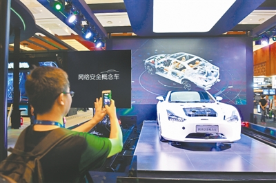 9月12日,一名参会者在大会展区拍摄一辆网络安全概念车。