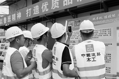 图为农民工扫描二维码参与“网上练兵”技能竞赛。