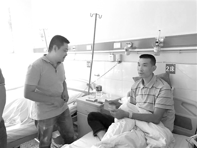 贵州省总工会工作人员看望受伤农民工蔡海,并送去慰问金。