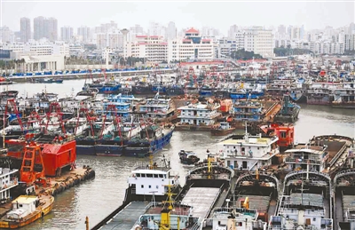 9月14日,大批船只在海口市新港码头避风。