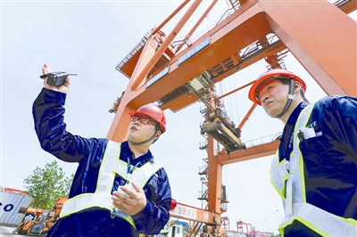 武汉国际集装箱有限公司操作部谢桥波师傅在指导他的徒弟——第二批小分队带队领导、武汉市国防科研工会主席王跃初(右)“站位盯箱”装卸理货业务。周勤 摄