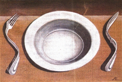“SOS”是国际通用的告急标识。画家让餐具 以救助的状况出现在桌面上,其寓意是多重意思:是粮食危机?还是信仰危机?
