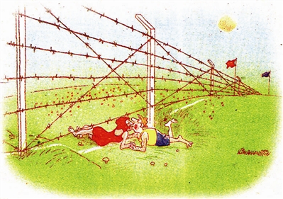 这对身处异国的恋人一时难以跨越边界,只得隔线暂短小聚,互倾情愫。“爱,是永远没有国门的”。愿天下有情人皆成眷属。
