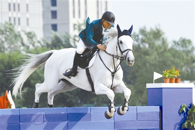 新疆选手多里坤·阿拜参加马术场地障碍赛。约提克尔·尼加提 摄