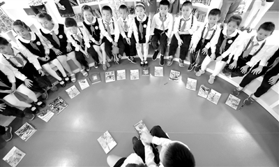 9月11日,北京市朝阳区芳草地国际学校三五班的小学生们正等待学校发给他们的“阅读存折”。学生们可以在“存折”中记录下自己所读的图书,根据读书量获得一定的奖励。此举是激励学生们“读经典的书,做有根的人”。