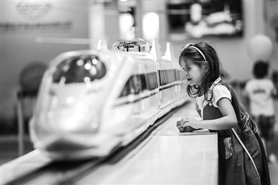 9月10日,在希腊塞萨洛尼基,一个女孩在萨博会中国馆参观中国高铁列车模型。