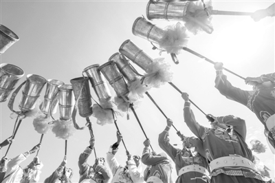 图为广灵县的民间艺人在为游客表演当地特有的民俗活动——吹大号。