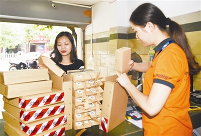 9月23日,在广西都安瑶族自治县一邮政网点,设计师赖俞希(左)寄送用环保材料包装的农产品。