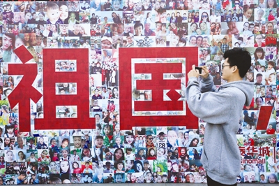笑脸墙由征集的1000多名市民的笑脸图片拼接而成,并配有“祖国,你好!”的字样。