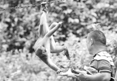 图为一只猴子在取游客手中的食物。