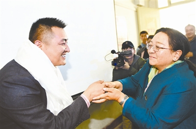博士生导师强俄巴·次央教授(右)向通过答辩的索朗次仁祝贺(10月7日摄)。
