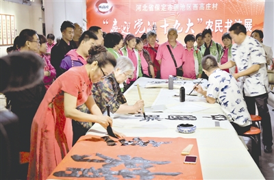 9月28日,河北省保定市莲池区西高庄村“喜迎党的十九大”农民书法展在北京国艺美术馆开展。参展的150多幅书法作品均出自西高庄村村民之手,作者年龄从8岁至85岁。书法班师生齐心协力,用手中的笔书写对美丽乡村的热爱,对美好生活的憧憬,对祖国、对党、对人民、对时代的赞颂之情。 本报记者 许之丰 摄