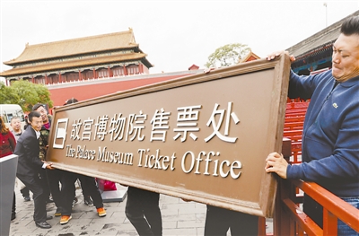 10月10日,工作人员将故宫博物院售票处牌匾摘下。即日起,故宫正式实行全网售票,每天8万张门票全部在网上销售,不再进行现场售票。此外,故宫将设置综合服务窗口,帮助外籍观众和部分没有线上支付能力的观众代客下单。杜洋 摄/中新社