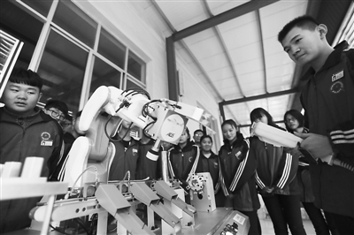10月10日,山西运城龙翔职业技工学校,教师向学生讲解机器人知识。随着智能化日益普及,技工学校开始开设机械信息自动化专业,教授学生机器人知识。 鲍东升 摄/中新社