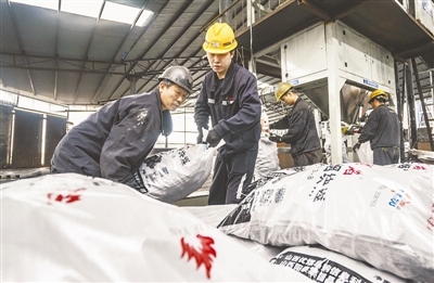 10月10日,山西省阳城县,一家互联网公司的煤炭仓储区内,工人们正在给煤炭打包,之后便通过互联网平台卖往全国各地。