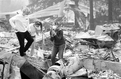 上图为10月10日,加利福尼亚肯伍德,当地居民玛丽(右一)的家被大火烧毁,不过她很幸运地在废墟中找到了结婚戒指。东方IC供图