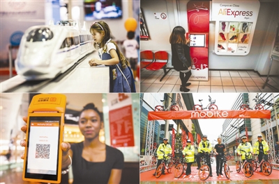 高铁、网购、移动支付和共享单车被誉为中国的“新四大发明”,彰显出中国式创新的强劲活力。拼版照片是:(左上)在希腊塞萨洛尼基,一个女孩在参观中国高铁列车模型;(右上)在智利首都圣地亚哥的一处智利邮政营业网点,一名女士在触摸屏上浏览阿里巴巴旗下的跨境电商平台全球速卖通;(左下)在加拿大多伦多约克戴尔购物中心,工作人员展示一名顾客所购商品的微信支付收款二维码金额(加拿大元);(右下)在英国曼彻斯特,几名警察在摩拜单车投放仪式上合影。