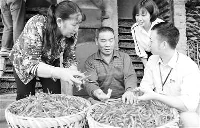 10月17日,古田县纪委结对帮扶干部苏东北(右一)在向县城东街道桃溪村脱贫户游良进夫妇(左一、左二)了解扶贫小额信贷资金的使用情况。