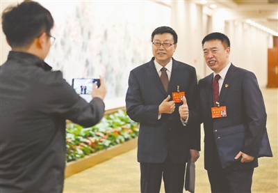 10月20日下午,十九大代表驻地,来自宁夏的马中贵代表(图左)在走廊见到了老朋友——中车长春轨道客车股份有限公司技术工人李万君。