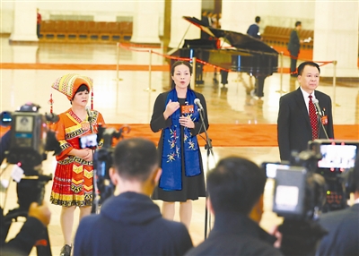 图④:湖北武汉市第一聋哑学校舞蹈老师杨小玲代表(图中)在“党代表通道”上接受记者采访。本报记者 杨登峰 摄