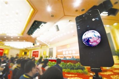 10月21日,十九大新闻中心举行的记者招待会现场,一位记者在用VR手机进行直播。十九大期间,新技术被众多媒体广泛运用。本报记者 杨登峰 摄