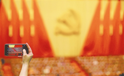 10月24日,在十九大闭幕会上,一位记者用手机拍照。本报记者 杨登峰 摄