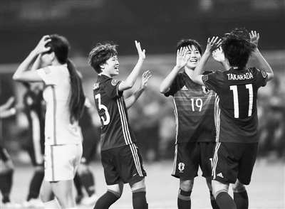 10月25日,日本队球员庆祝进球。当日,在江苏南京进行的2017年亚足联U19女足锦标赛半决赛中,中国队以0比5不敌日本队,无缘决赛。新华社记者 季春鹏 摄