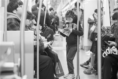 近日,北京地铁6号线车厢内,在周围人大都低头看手机时,一名小女孩在专注阅读纸质儿童书。