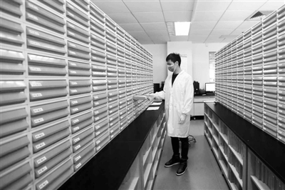 近日,投资近亿元的国内首家生物银行在上海张江正式启用,这也是国内规模最大,同时具有国际一流水准的生物银行。生物银行是指独立的生物样本存储机构,储存品不是钱,而是组织、血液、细胞、器官、DNA等生物样本和与其相关的临床、病理、治疗、随访、知情同意等资料以及其质量控制、信息管理与应用系统。预先把人的细胞、血液等生物样本储存到生物银行,当科研或者临床治疗需要时,可以再把它们提取出来。图为高高的架子上有一个个类似保险柜的小抽屉,制作完成的生物样本储存其中。柏可林 摄/东方IC