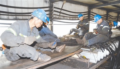 今年以来,同忻矿狠抓大型设备现场管理,不断强化技术指导,使设备完好率、皮带接头合格率均达到100%。图为该矿员工正在进行硫化皮带接头。