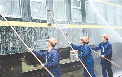 洗车组共有9名员工,他们各有分工,有负责往车皮上洒水的,有负责擦洗车剂的,有负责擦拭车窗的。车皮也被划分为上中下三块,分别由不同工人用不同长度的刷子刷洗。陈亚 摄
