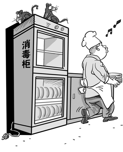 据《北京青年报》报道,日前,国家食药监总局出台了最严最全的餐饮行业监管文件,其中“消毒”一词出现了16次。然而记者走访十余家大堂放置有消毒柜的餐厅发现,有些餐厅的消毒柜并未真正“消毒”,而是处于关闭状态,成了盛放餐具的“摆设”。
