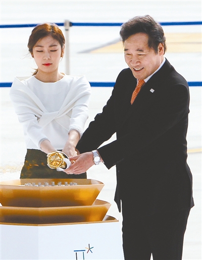 11月1日,韩国总理李洛渊(右)与平昌冬奥会大使、韩国花样滑冰运动员金妍儿共同点燃仁川机场的圣火盆。