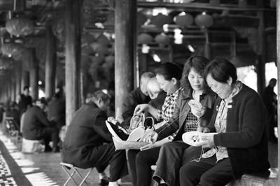 11月2日,湖北省宣恩县刺绣合作社社员游金玉(右一)、周仕月(右二)与周银菊(右三)在风雨桥上绣鞋垫。