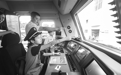 11月4日,南宁铁路局举办市民开放日活动,邀请112名本地市民到“火车之家”南宁机务段近距离体验火车驾驶。许多家长带着孩子到动车模拟舱尝试操作驾驶,感受中国铁路发展与变化。图为火车司机正在教孩子如何驾驶普速火车。本报记者 庞慧敏 通讯员 唐一志 摄