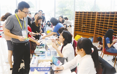 11月5日,在越南岘港,亚太经合组织领导人会议周国际媒体中心的工作人员为记者办理证件。