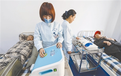 11月6日,河北廊坊市广阳区新开路街道金星道社区养老服务中心医护人员为老人进行治疗。