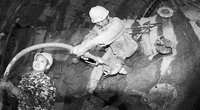 中铁十一局郑万高铁(湖北段)三分部针杏桥坪隧道地质破碎,围岩结构复杂多变,给施工安全带来了巨大挑战。该分部及时调整施工方案,变微台阶全断面掘进为三台阶渐进式掘进,通过帷幕注浆,封闭围岩结构和泥沙层,防止隧道坍塌。图为工人正在紧握输浆管往超前导管里注浆以封闭岩层。(特约通讯员 郑传海摄)