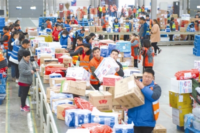 “双十一”当天,天津市武清区的仓库内,工作人员正在分拣包裹。 本报记者 王伟伟 摄