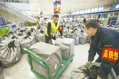 11月11日,西安北站,工作人员在搬运包裹。当日,由西安开往兰州、装载着80件快运包裹的高铁列车驶出西安北站,这是西安铁路局与中铁快运新推出的“丝路高铁快运”。与去年相比,中铁快运西安分公司今年发送的高铁快运件数增长了283%。王曙天 摄