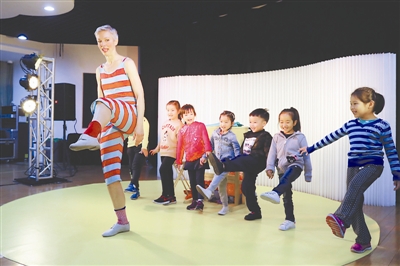 11月8日,在上海徐汇区科技幼儿园,演员索菲亚和孩子们一起表演。
