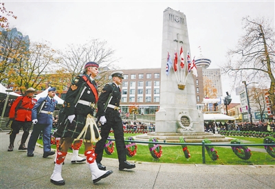 11月11日,军人在加拿大温哥华参加国殇日纪念活动。