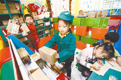 11月15日,山东青岛通济实验学校仇家由和幼儿园的小朋友在进行邮递员工作体验。