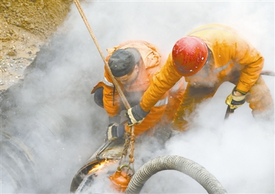 更多时候,这样的抢修是在堆积着污水、黏稠物,散发着阵阵恶臭的狭小空间里进行的。