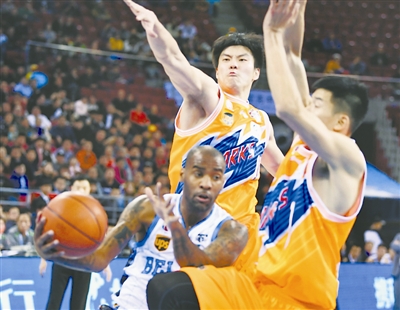 11月15日晚,北京五棵松体育馆,北京首钢队以108比98战胜上海队。图为双方在拼抢。本报记者 许之丰 摄
