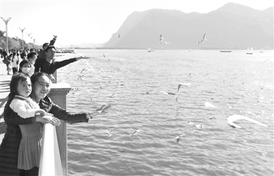 图为游人在昆明滇池边与前来越冬的红嘴鸥嬉戏。