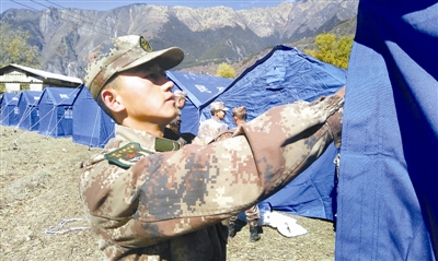 11月18日,西藏军区林芝军分区官兵在米林县派镇直白村搭建救灾帐篷。
