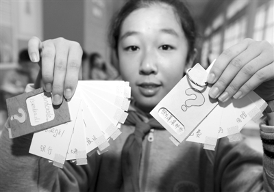 11月16日,宝山实验学校的学生在展示“金点子”——自制“闪记卡”。当日,“我为核心价值观代言”——上海少年“修身金点子”征集行动在上海中国福利会少年宫进行成果展示。新华社记者 刘颖 摄
