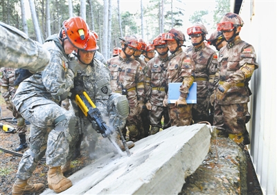 11月18日,在美国俄勒冈州锡赛德的国民警卫队拉里叶军营,中方参演人员观摩美方参演人员演练狭小空间救援。