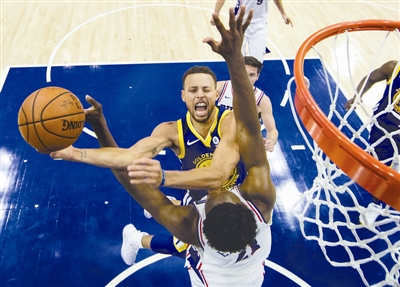 11月18日,勇士队球员库里在比赛中飞身上篮。当日,在2017-2018赛季NBA常规赛中,金州勇士队客场以124比116战胜费城76人队。 新华社/美联